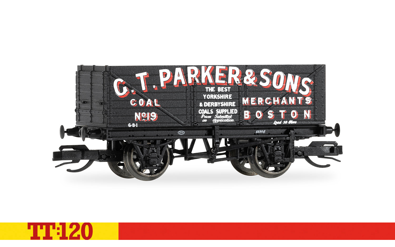 This TT:120 seven-plank wagon, in a black livery finished with white lettering and red drop shadow; 'G.T.Parker & Sons', is carrying the number '19'.