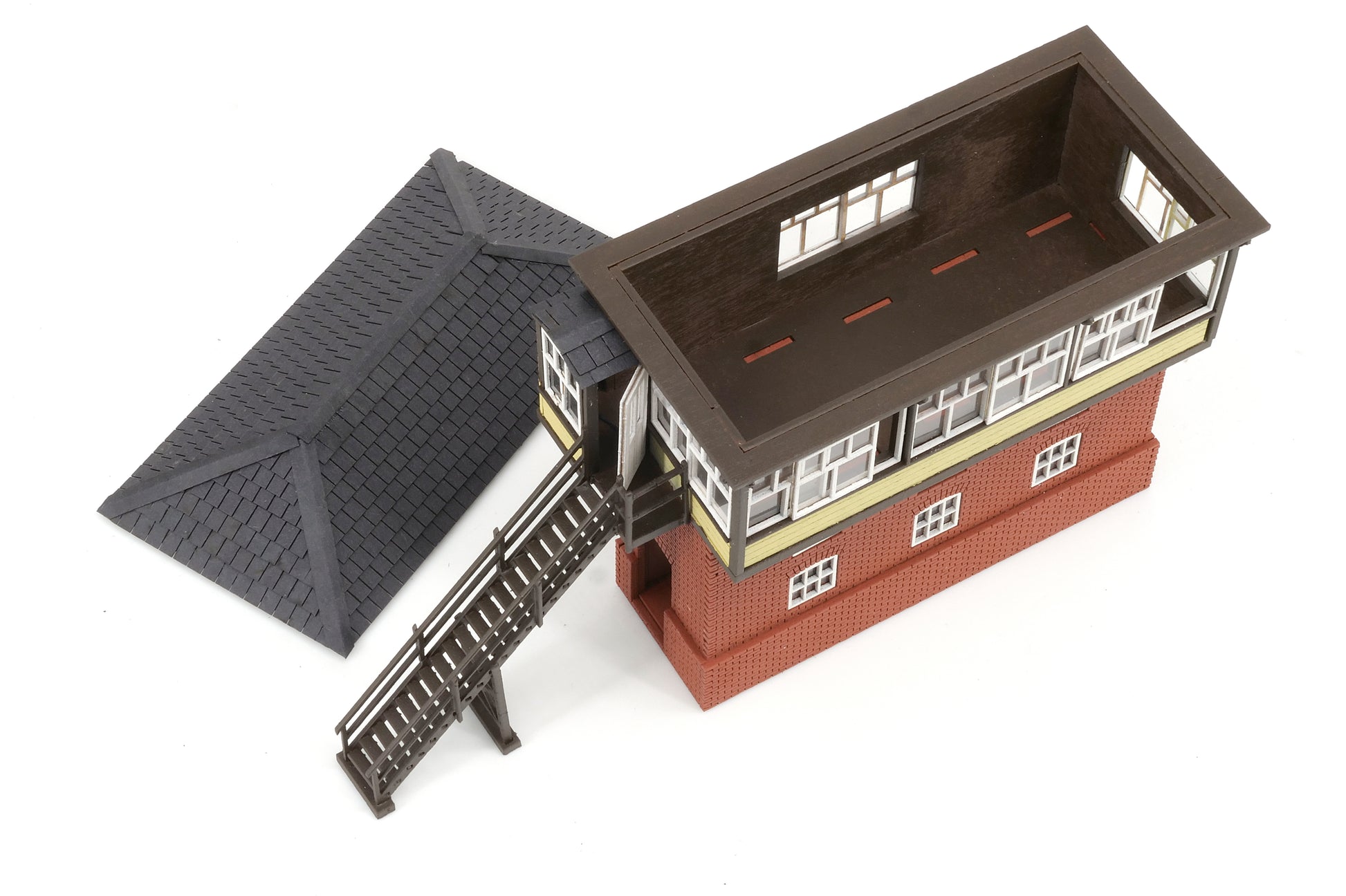 The plywood and MDF kit contains a full set of parts to build the structure of the 1909-built Great Western Railway Type 27C signalbox. The structure had a 25ft x 12ft timber cabin supported on a brick base with the cabin significantly wider to allow good vision for the signalman while also meeting the restricted space for the 'box.