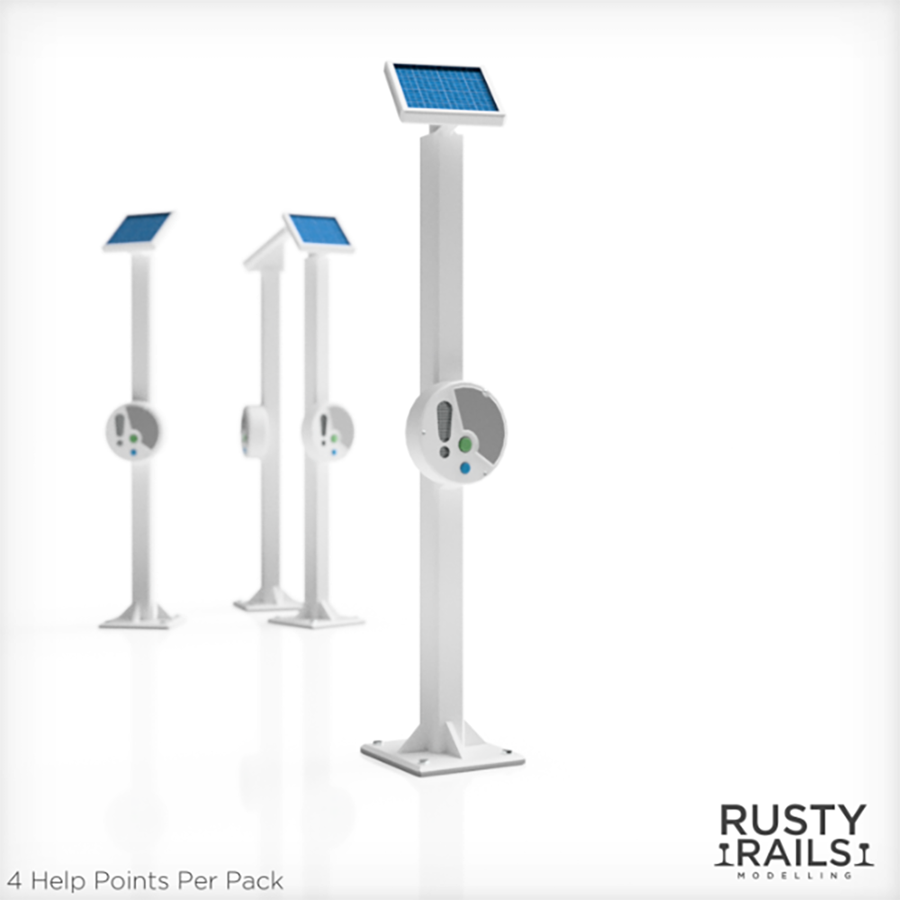 Add a touch of modern detail to your model railway platforms with these 'OO' gauge Help Points from Rusty Rails Modelling. These devices are positioned on station platforms to provide safety and information to passengers.